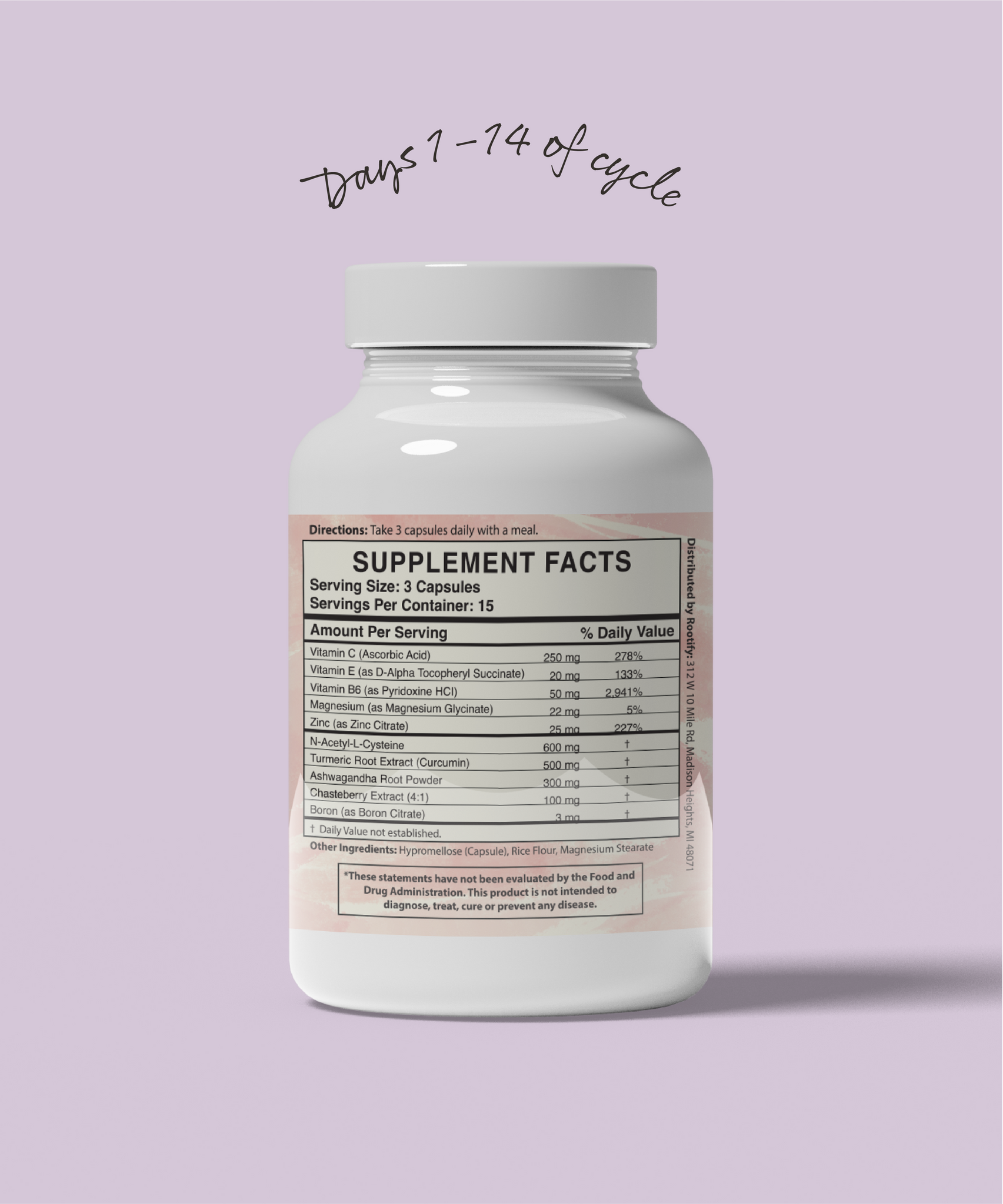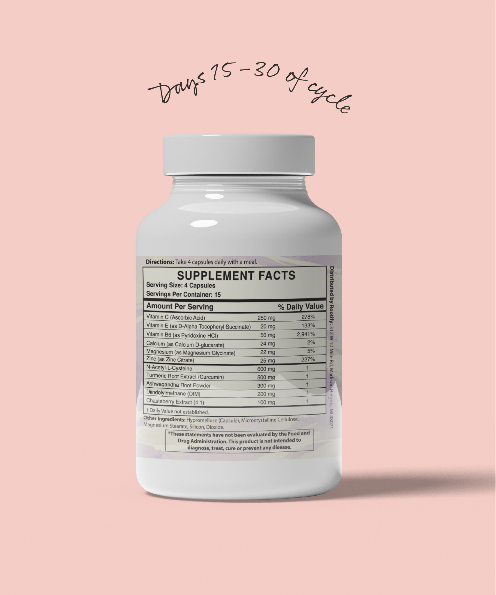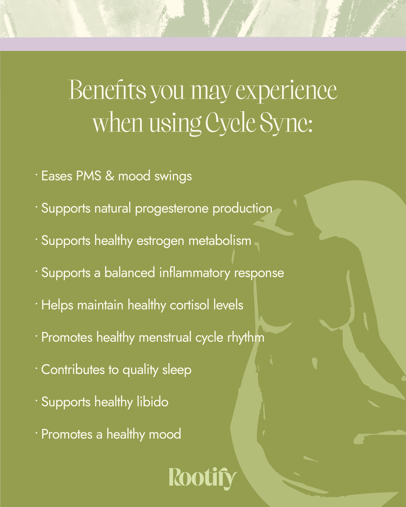 • You should see improved symptoms within a couple weeks. However, it is suggested to take for at least 3 months before seeing changes in your menstrual cycle. The closer you can track your cycle to this product, the better the results. The product should also be accompanied by healthy habits such as proper hydration, daily movement, quality sleep, reducing stress, and an anti-inflammatory nutrition approach.*