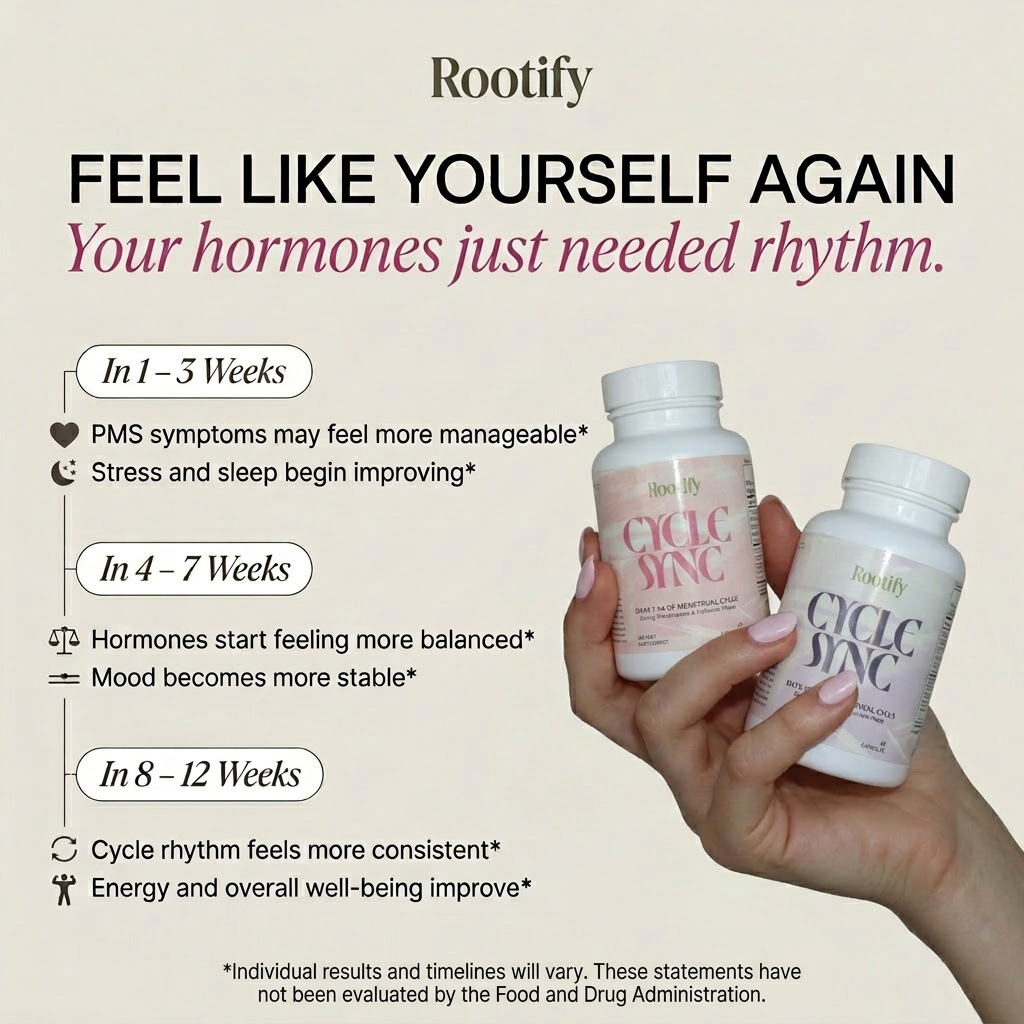 You should see improved symptoms within a couple weeks. However, it is suggested to take for at least 3 months before seeing changes in your menstrual cycle. The closer you can track your cycle to this product, the better the results. The product should also be accompanied by healthy habits such as proper hydration, daily movement, quality sleep, reducing stress, and an anti-inflammatory nutrition approach.*